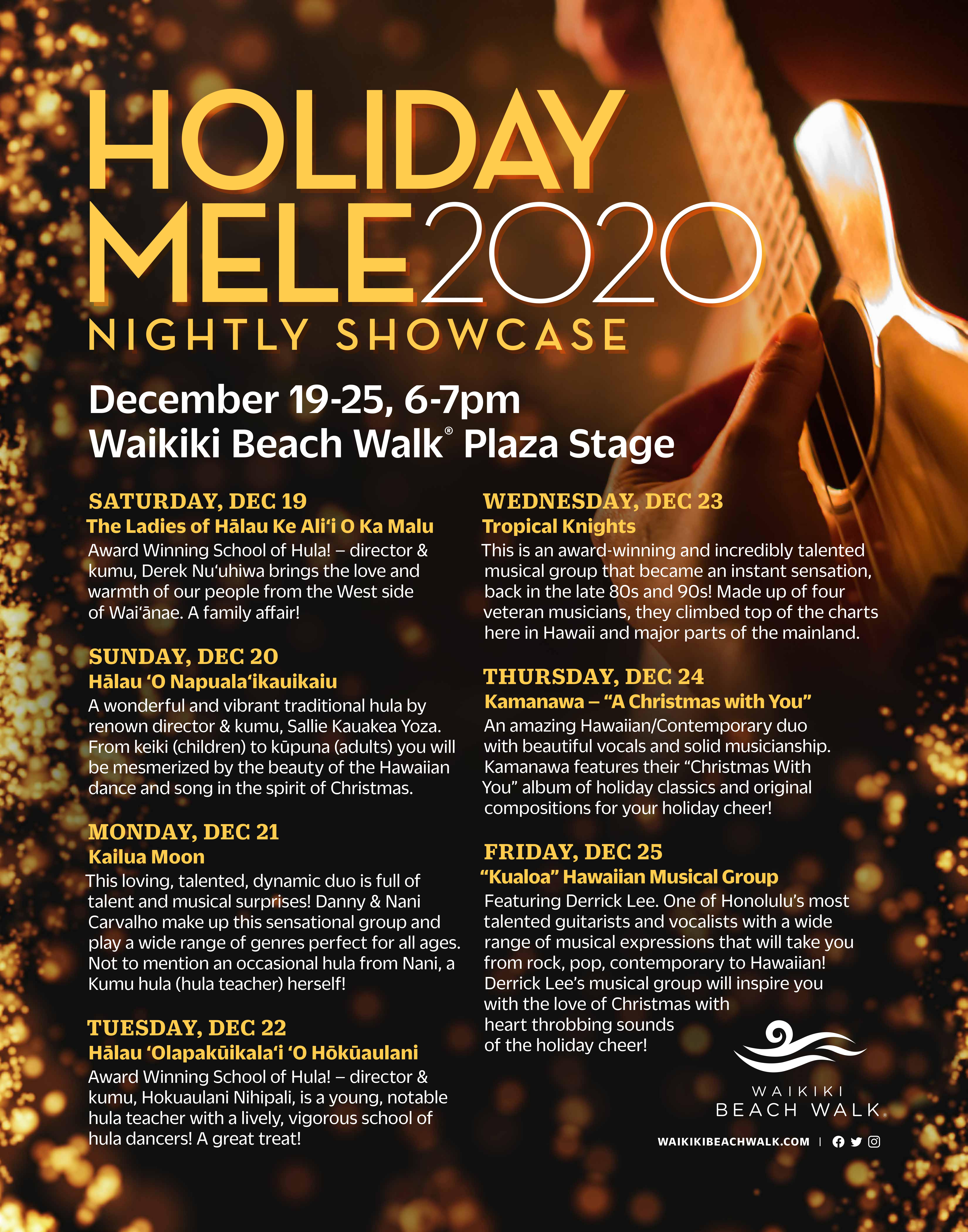Join us at the Plaza Stage for a week of holiday cheer. The Holiday Mele is our annual Hawaiian-style Christmas music showcase featuring live performances by local musicians and hula dancers. The event kicks off this Saturday, December 19th, and takes place each evening from 6:00 – 7:00 p.m. until Christmas Day.