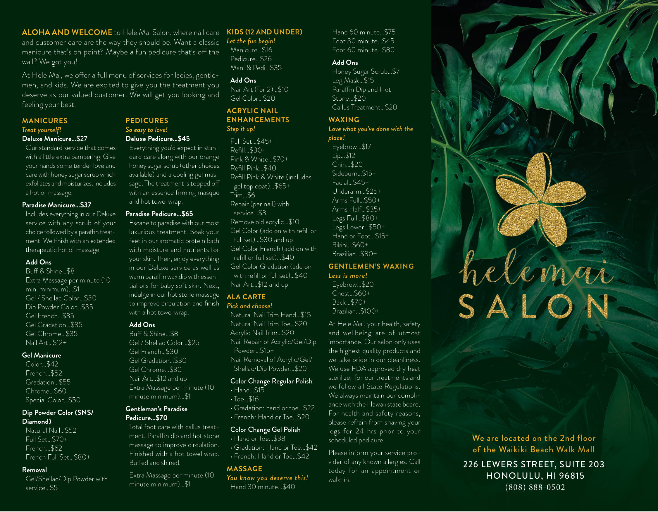 How about a luxurious manicure and pedicure, complete with paraffin treatments and honey sugar scrubs for baby soft skin? Or what about an invigorating hand and foot massage for improved circulation? If you’re in need of hair removal, Hele Mai Salon has you covered with a full menu of waxing services as well.